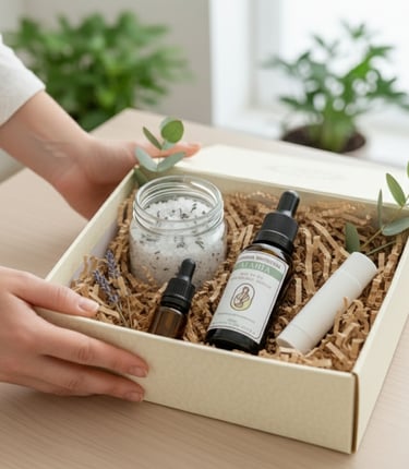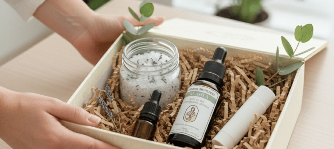 Montagem exclusiva da caixa terapêutica com produtos personalizados,
